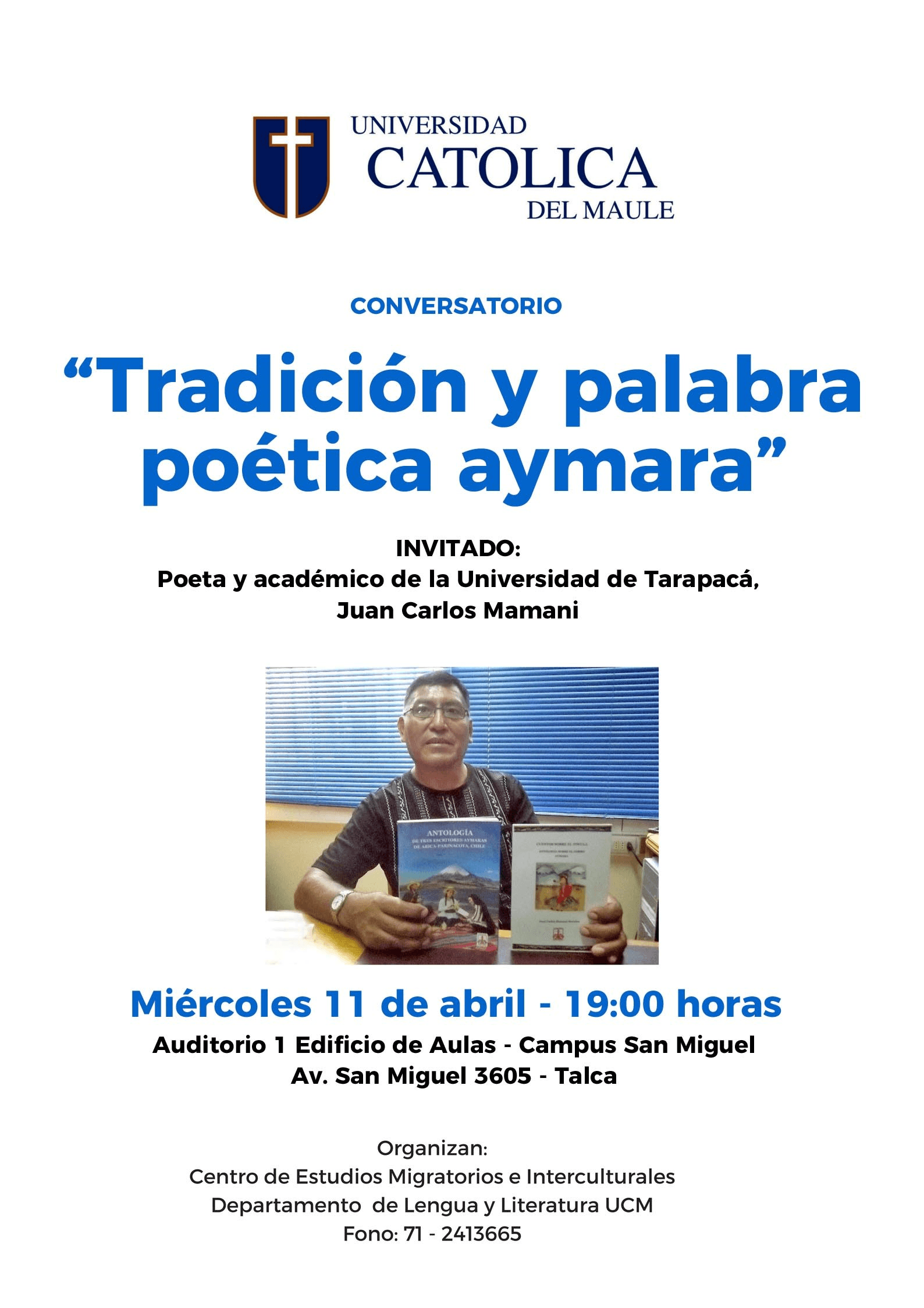 “Tradición y palabra poética aymara” lleva por título el conversatorio que dará a la comunidad el reconocido poeta y académico de la Universidad de Tarapacá, Juan Carlos Mamani, actividad organizada conjuntamente por el Centro de Estudios Migratorios e Interculturales y el Departamento de Lengua Castellana y Literatura de la Universidad Católica el Maule.