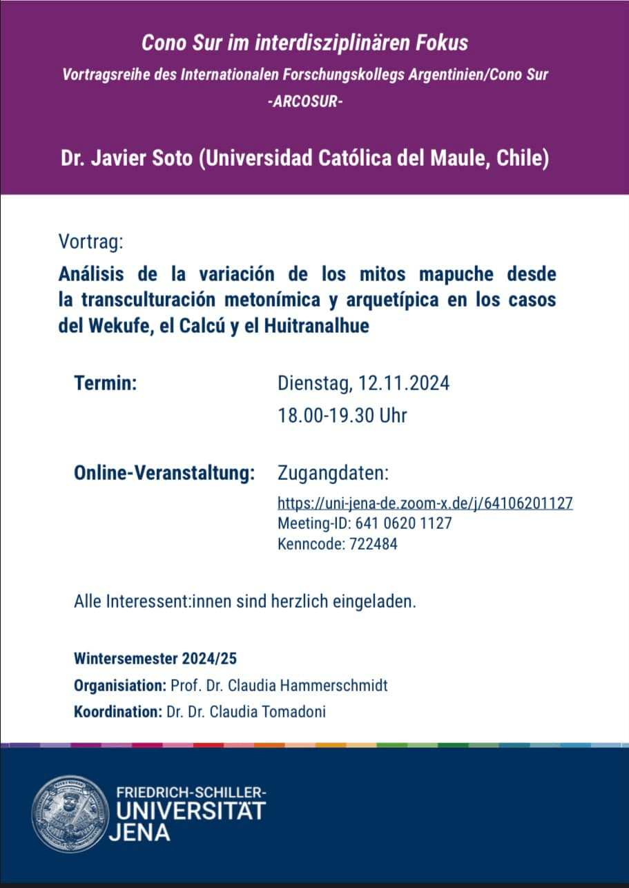 Desde Berlín, el Profesor Soto presentó de manera virtual su ponencia titulada “Análisis de la variación de los mitos mapuche desde la transculturación metonímica y arquetípica en los casos del Calcú, el Wekufe y el Huitranalhue”. Parte de esta investigación sobre el Huitranalhue fue desarrollada en colaboración con la alumna Catalina Vergara, cuya tesis de grado fue plasmada en un artículo coautoría durante el año 2023. En reconocimiento a su trabajo, el Profesor Soto fue invitado por la Asociación Alemana del Profesorado de Español (DVS) a publicar un artículo centrado en las figuras del Wekufe y el Calcú en la revista Hispanorama, con publicación prevista para el año 2025.