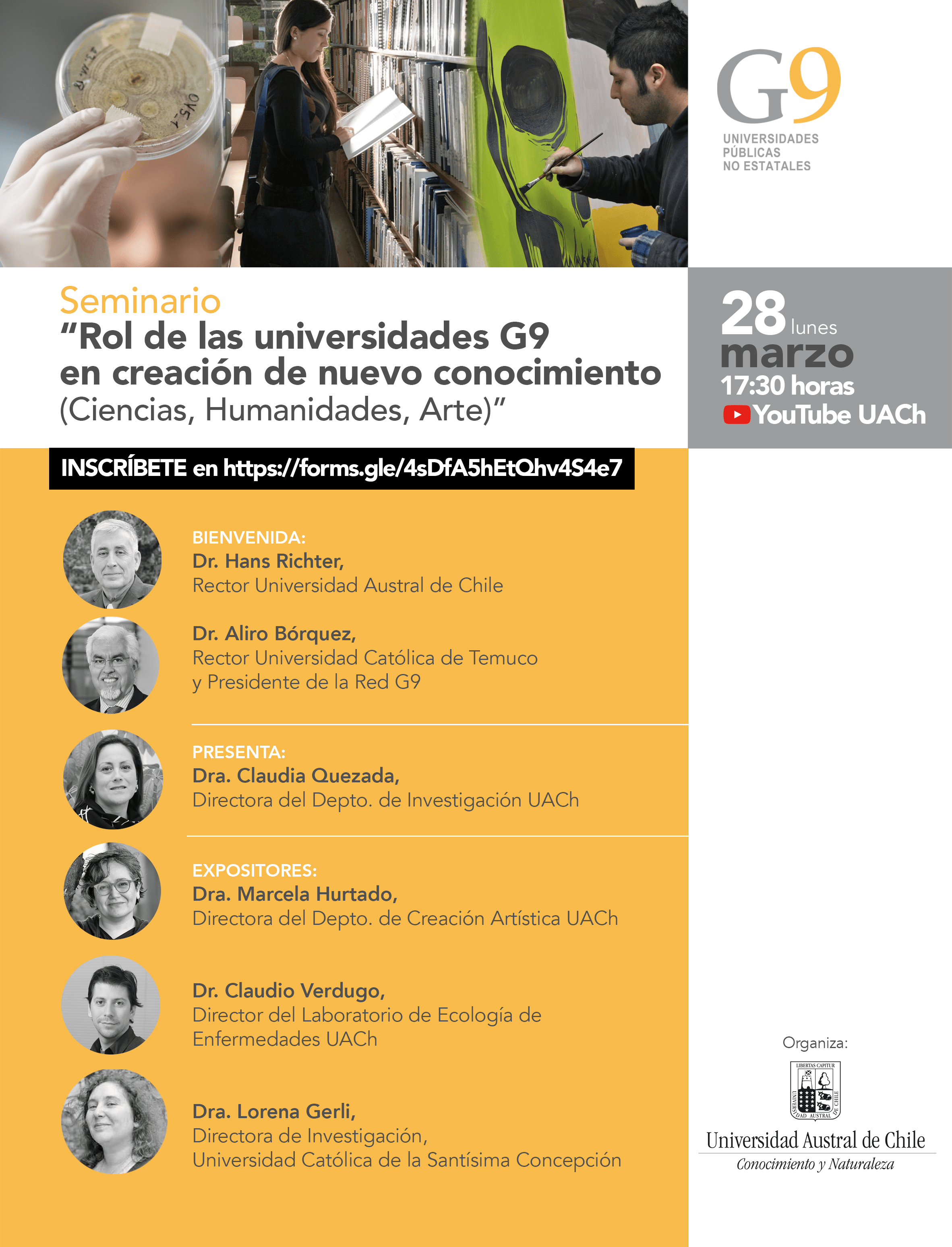 Invitamos a la comunidad a inscribirse en el siguiente formulario para participar en este conversatorio, el cual será transmitido a través del canal de YouTube de la UACh, la señal de televisión UCV TV y en todas las plataformas digitales de las universidades G9.