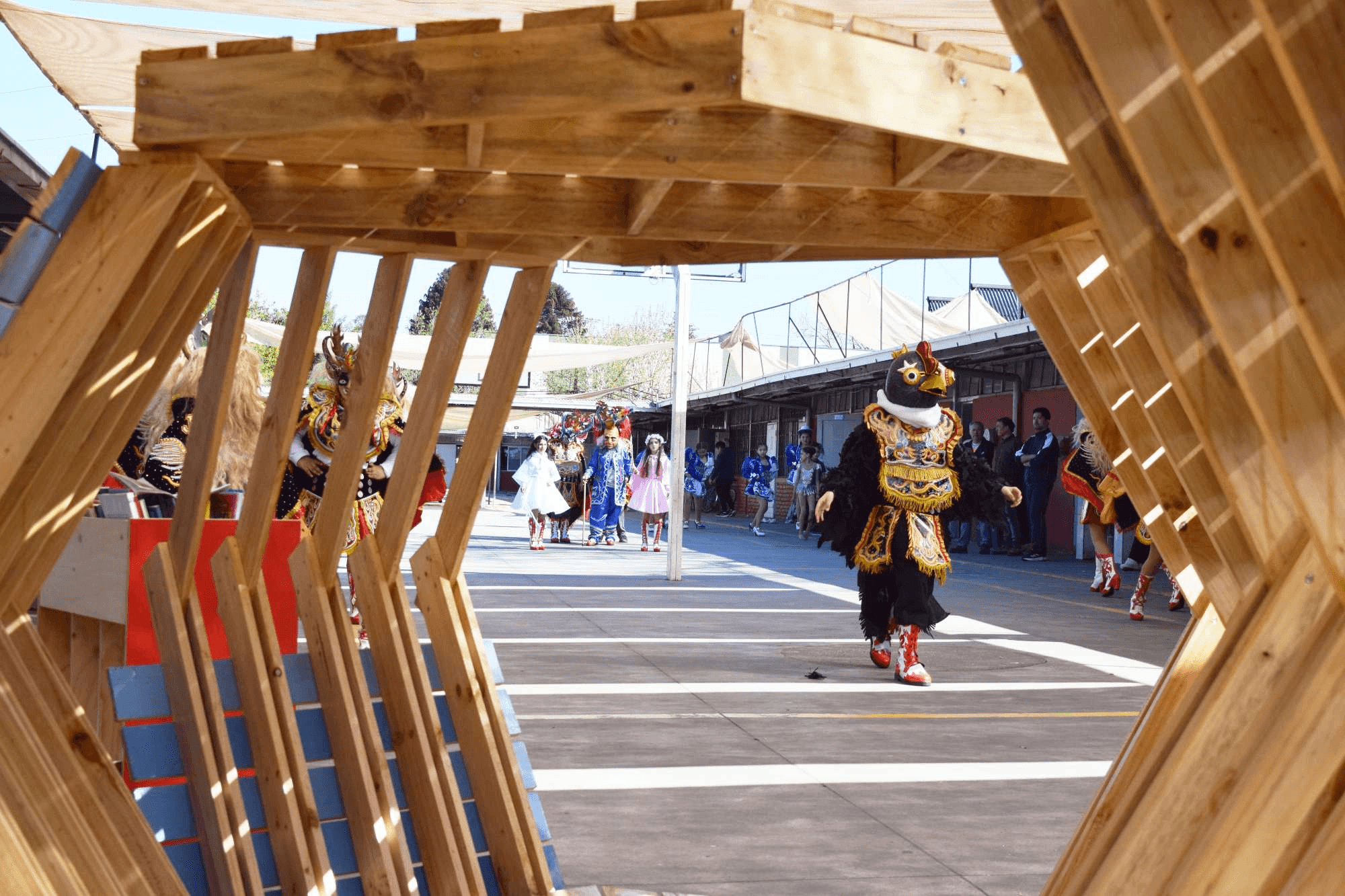 Ese mismo día, durante la tarde, la Escuela Juan Luis Sanfuentes recibió tres instalaciones dentro de su establecimiento, elementos diseñados y elaborados por estudiantes de Arquitectura UCM, con foco en la mejora del bienestar y uso recreativo de los patios. Los estudiantes de Taller de Arquitectura I sección 2, de los profesores Marcelo Rojas y Domingo Sarmiento, pintaron un mural de composiciones bidimensionales en los muros exteriores del Jardín Infantil del establecimiento; las y los estudiantes de Sistemas Constructivos I, ambas secciones de los profesores Paula Salgado y Jaime Latorre, construyeron módulos en madera de contención y lectura (denominados “pequeños refugios”) y una radio para la escuela.