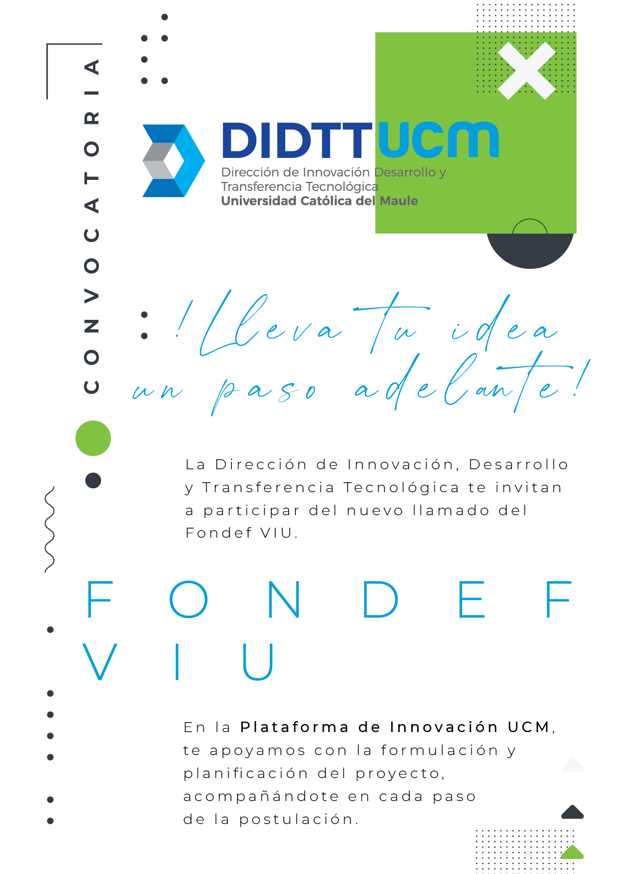 Desde la DIDTT y Plataforma de Innovación, se invita a los estudiantes a participar de esta convocatoria y acercarse con sus ideas a la unidad para poder apoyarlos en sus dudas y consultas en relación al concurso. Para más detalles del concurso revisar el siguiente link: https://lnkd.in/g7nYGAFR