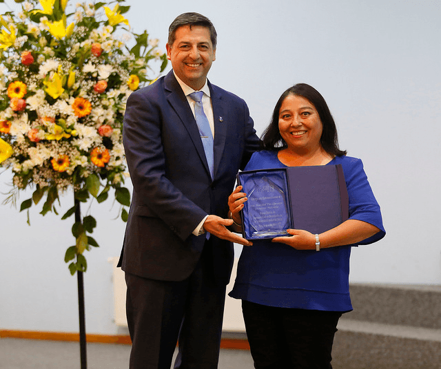 En esa misma línea, el vicerrector Castillo, fue el encargado de entregar un premio a la ingeniera Maribel Troncoso, como primera egresada del Programa de Prosecución de estudios año 2018. Maribel además pertenece a la primera generación de ingreso (1994) de la carrera de ingeniería en construcción de la UCM.