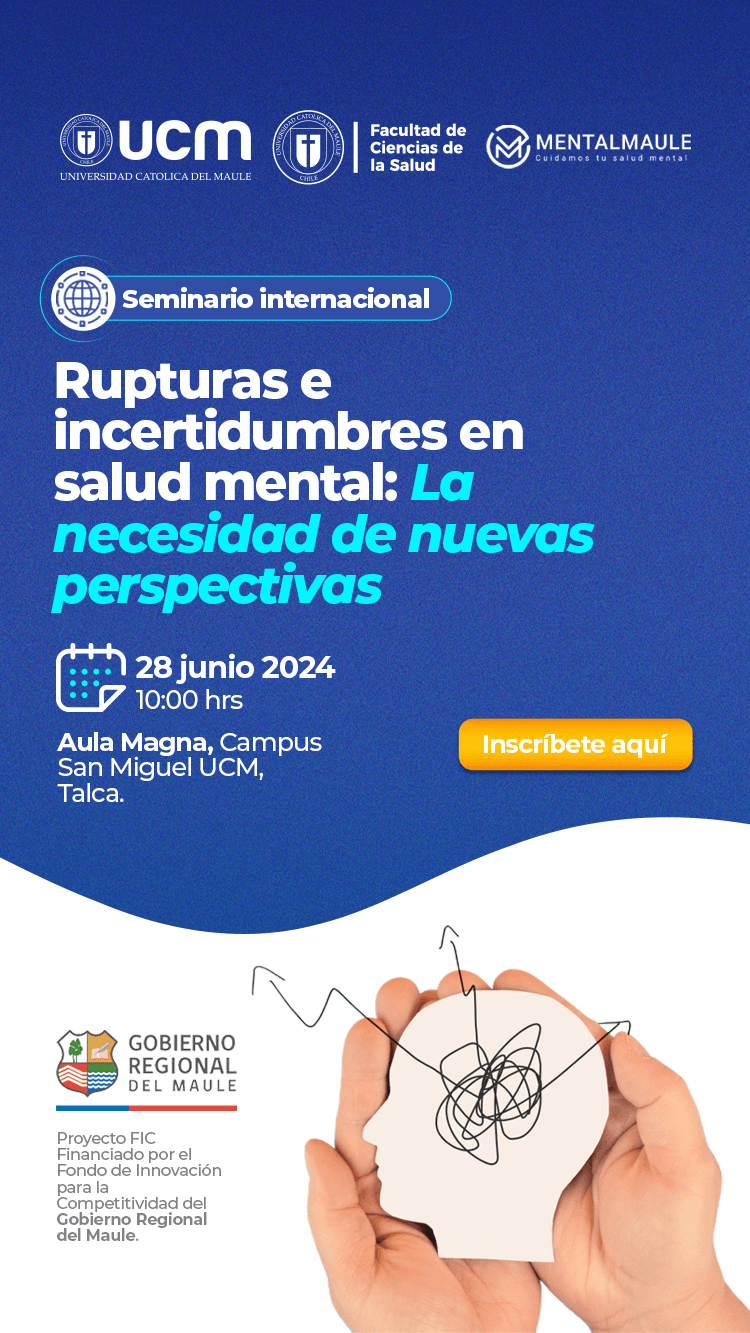 El próximo 28 de junio, la Universidad Católica del Maule (UCM) será sede de un importante seminario internacional titulado "Rupturas e incertidumbres en salud mental. La necesidad de nuevas perspectivas". El evento, organizado por el proyecto "MentalMaule" y apoyado por el Fondo de Innovación para la Competitividad (FIC) del Gobierno Regional del Maule, se llevará a cabo en el aula magna Monseñor Carlos González Cruchaga del Campus San Miguel en Talca a partir de las 10:00 horas.