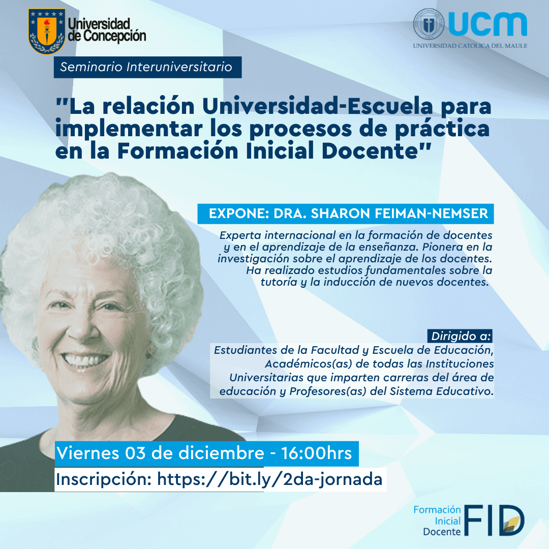 La actividad académica organizada por el Proyecto de Formación Inicial Docente (FID) de la Universidad Católica del Maule (UCM) y la Universidad de Concepción (UdeC), considera dos jornadas, la primera de ellas programada para este viernes 26 de noviembre a las 16:00 horas y la segunda, el 03 de diciembre en el mismo horario.