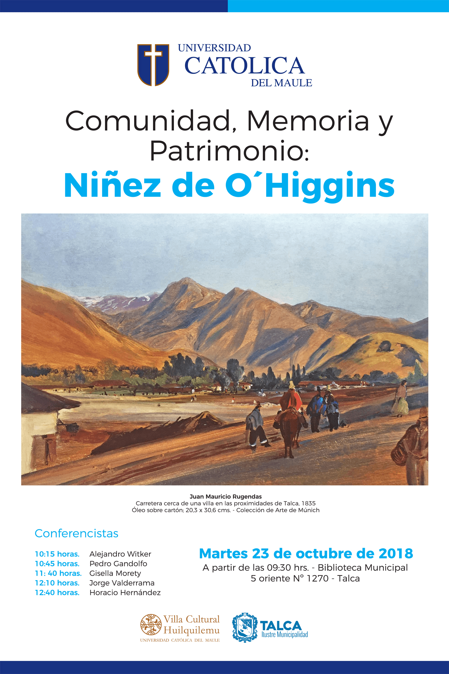 “Comunidad, memoria y patrimonio: niñez de O´Higgins”, es el nombre del seminario que lideran la Universidad Católica del Maule (UCM), a través de su Villa Cultural Huilquilemu, y la Biblioteca Municipal de Talca, y el cual se realizará el próximo martes 23 de octubre, a partir de las 09:30 horas en dicha biblioteca, ubicada en 5 oriente N°1270 de la capital regional.