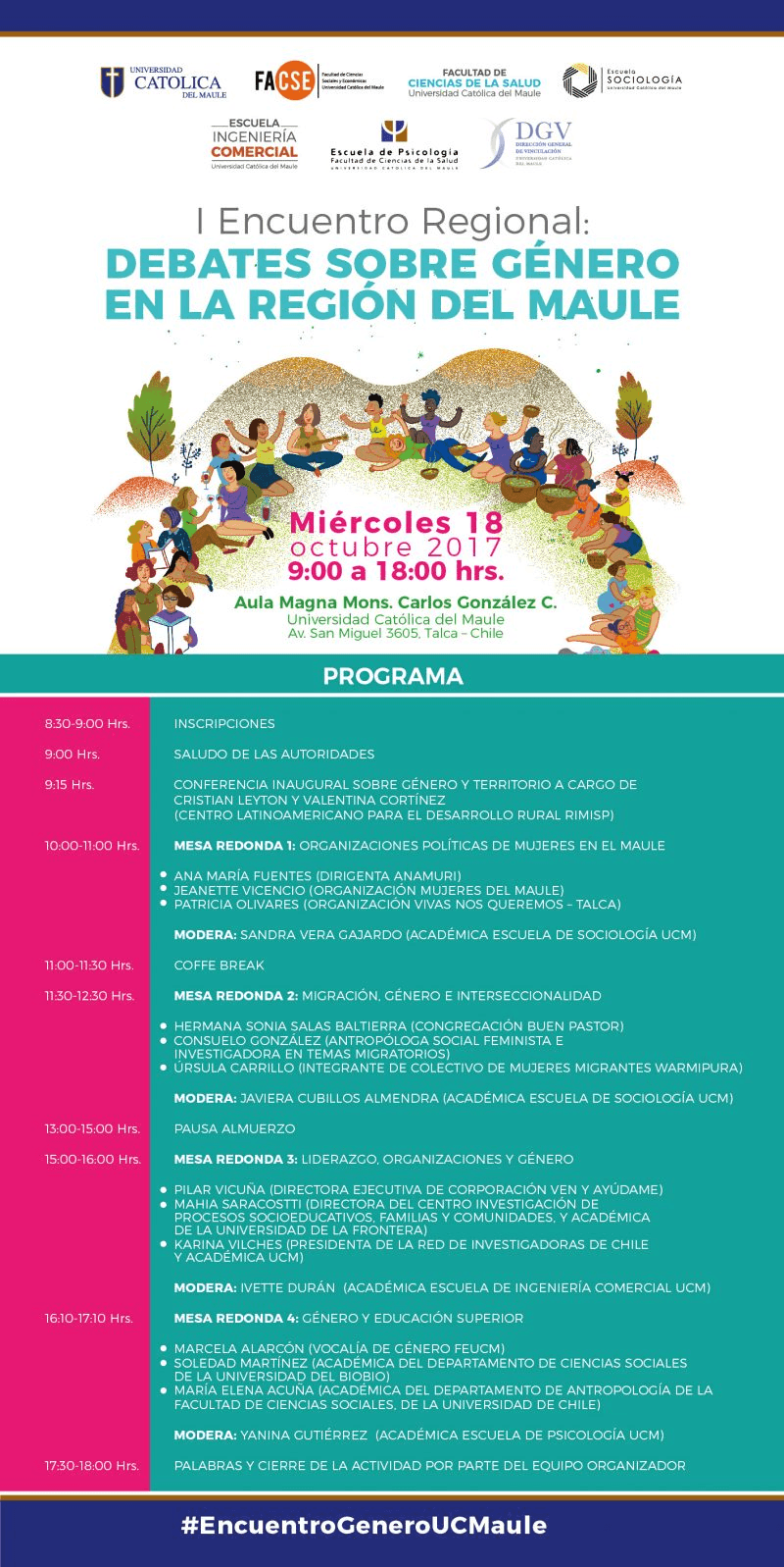 Migración, educación superior, liderazgo y participación política, son parte de los tópicos que abordará el Primer Encuentro Regional: Debates sobre Género en la Región del Maule, a realizarse el próximo miércoles 18 de octubre entre las 09:00 y 18:00 horas en el Aula Magna Monseñor Carlos González C. de la Universidad Católica del Maule, en Talca.