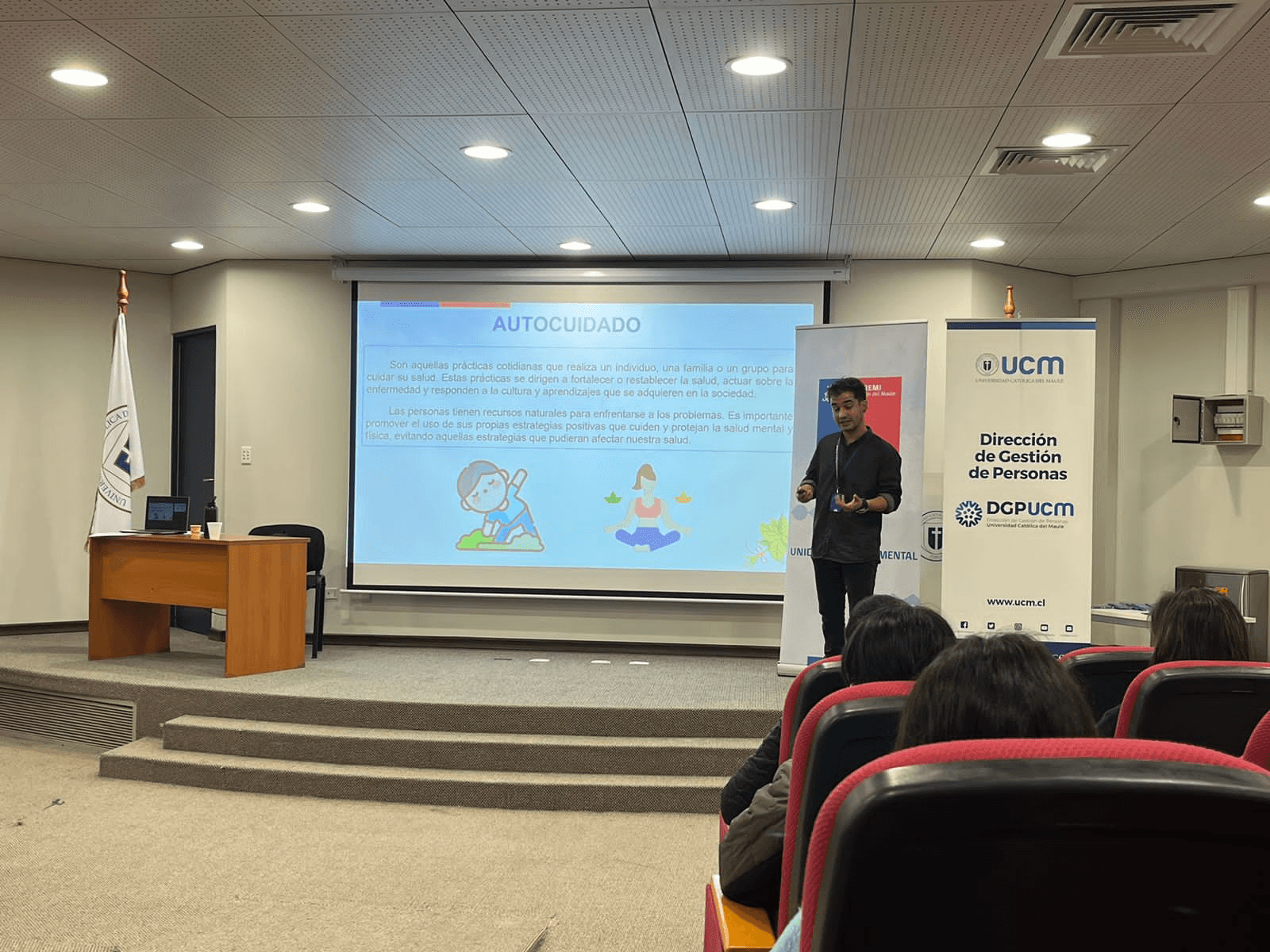 Hasta la Universidad Católica del Maule (UCM), llegaron los profesionales de la Secretaría Regional Ministerial de Salud, Carla Fuenzalida y Lucas Fuentes, para dar una charla sobre autocuidado organizada por el Departamento de Bienestar, perteneciente a la Dirección de Gestión de Personas.
