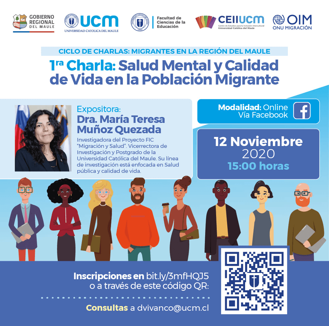 Con la ponencia de la vicerrectora de Investigación y Postgrado de la Universidad Católica del Maule, Dra. María Teresa Muñoz, llamada Salud Mental y Calidad de Vida en la Población Migrante, se dará el inicio a este ciclo de charlas, una instancia en la que expositora entregará un detallado informe de los problemas de salud mental existentes en el país, los componentes que determinan la situación de la salud mental de las personas migrantes, los principales motivos de consulta referidos por dichas personas, para luego ahondar en los factores que son relevantes para que la población migrante pueda tener una buena calidad de vida, además de detallar los riesgos psicosociales a los que se ven expuestos en el trabajo.