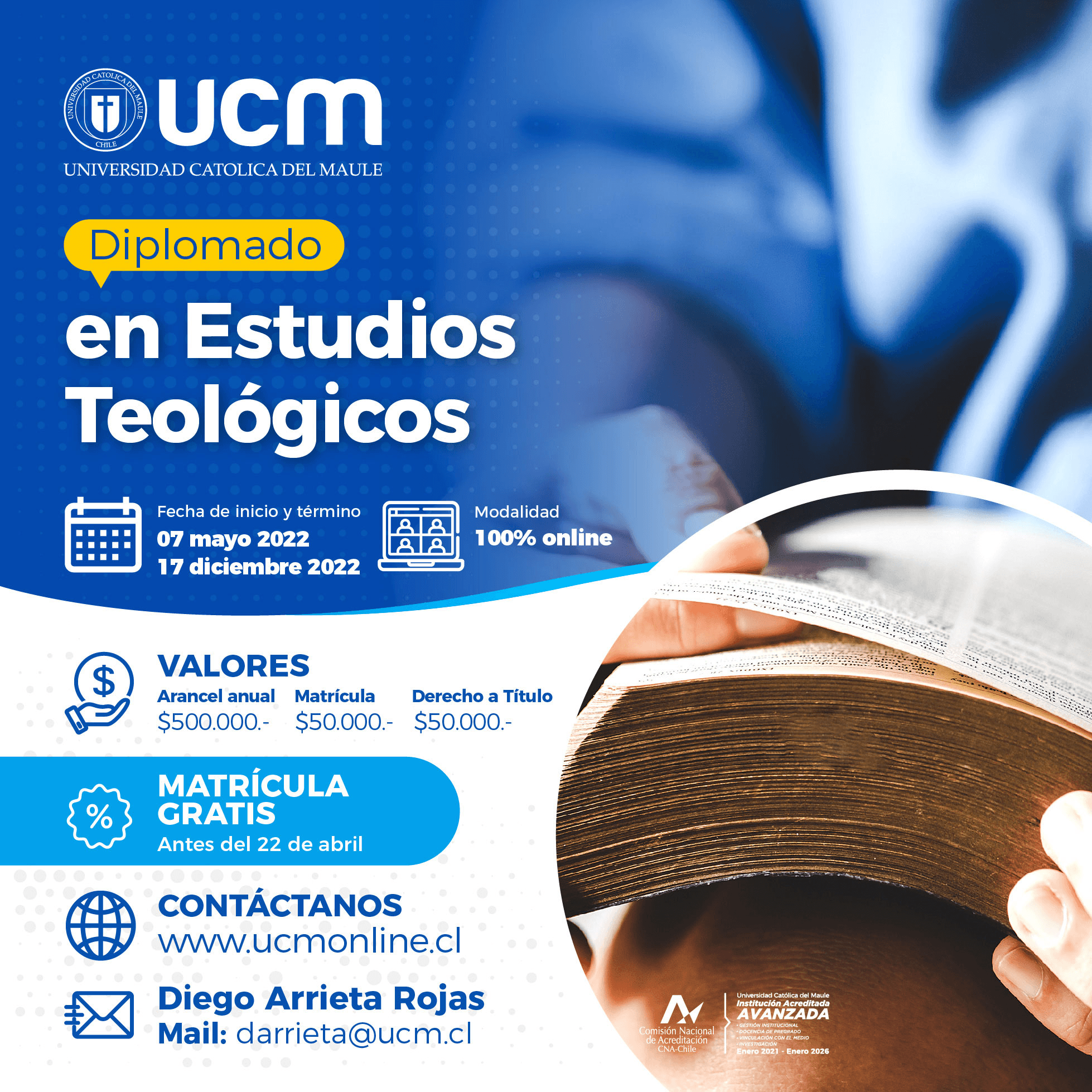 Quien desee mayor información puede escribir al correo darrieta@ucm.cl o ingresar al sitio web: www.ucmonline.cl