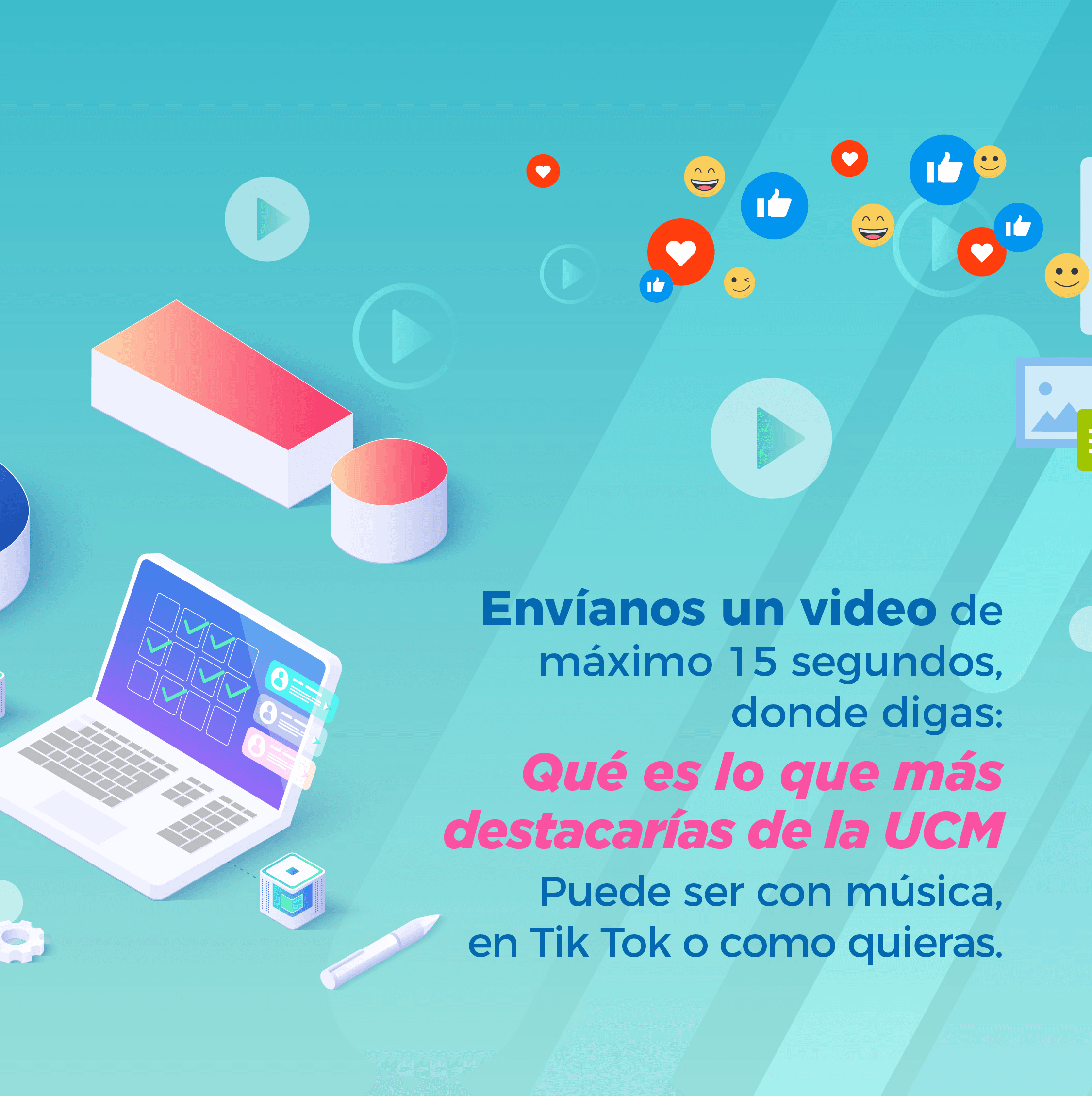La Dirección de Comunicaciones lanzó una atractiva convocatoria para encontrar a estudiantes UCM que formen parte del Staff de Promoción en colegios. Para participar los interesados deben enviar un video de máximo 15 segundos, en el que respondan: Qué es lo que más destacarían de la UCM. El video puede ser con música, en Tik Tok o como prefieran.