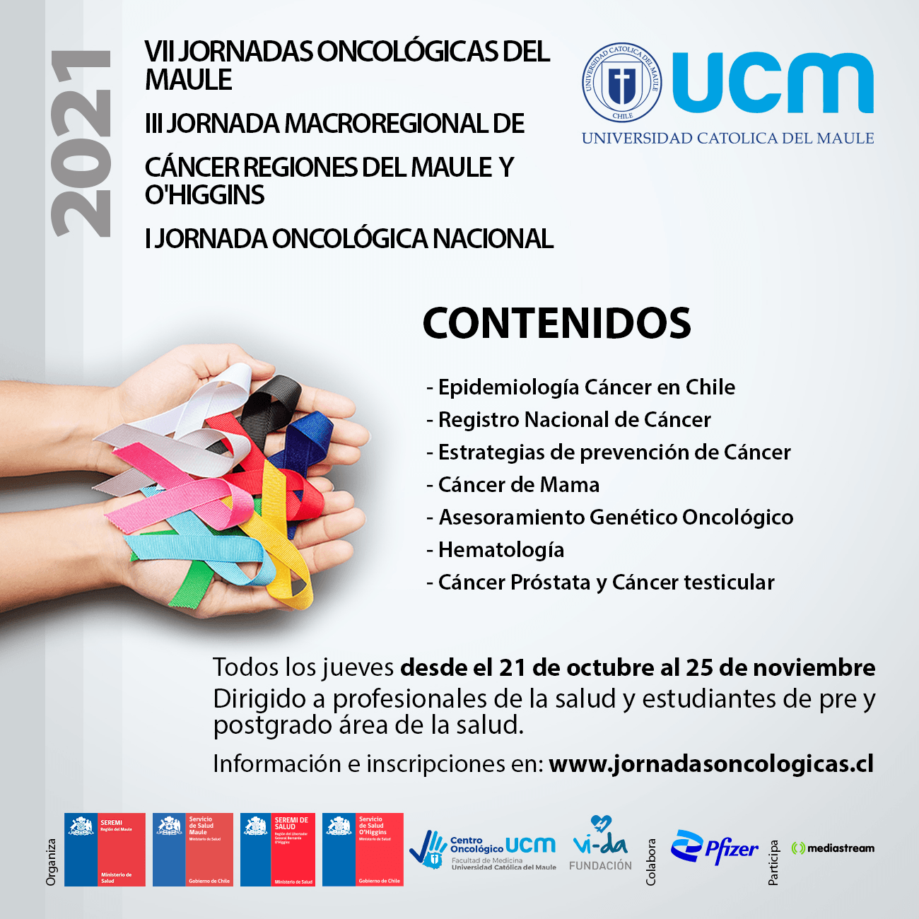 Desde el 21 de octubre al 25 de noviembre se realizarán las VII Jornadas Oncológicas del Maule, las III Jornada Macroregional de Cáncer Regiones del Maule y O´Higgins y la I Jornada Oncológica Nacional, organizadas por el Centro Oncológico UCM, Seremi de Salud del Maule, Seremi de Salud de O´Higgins, Servicios de Salud de Salud de ambas regiones y la Fundación Vi-da.