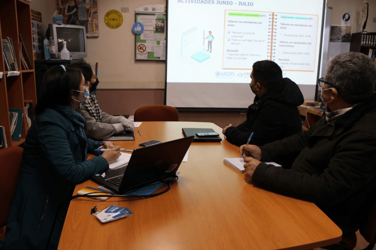 Por su parte, la facilitadora del programa PACE UCM, Angélica Fuentes, en relación a las actividades con los docentes indicó: “Conversamos de las actividades que hemos desarrollado en cuanto a habilidades transversales, exploración vocacional, retroalimentación de talleres con estudiantes, porque es importante saber la apreciación de los profesores jefes en cuanto a los talleres que se están implementando en el aula”.