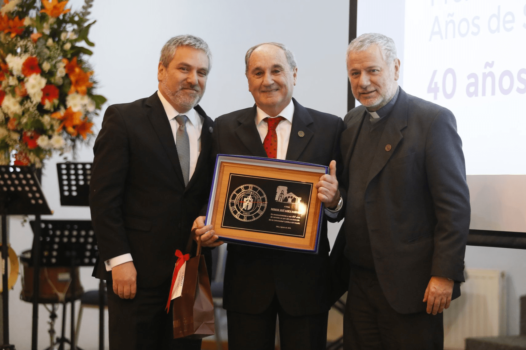 El secretario general, Dr. Patricio Gatica, también cumplió 40 años trabajando para la UCM, y comentó valor el camino recorrido. “Me llena de emoción, felicidad y agradecimiento el haber pasado gran parte de mi vida en esta hermosa institución, primero en mi condición de estudiante y luego como profesional”, dijo.