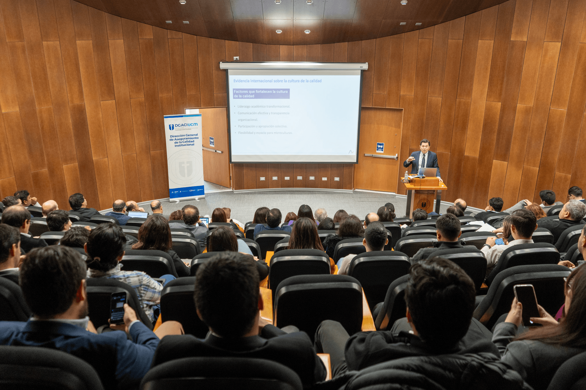 “Para que la calidad sea enfrentada por toda la comunidad universitaria también se requiere un cambio de cultura y es lo que denominamos gestión del cambio. Hoy día se espera que la calidad sea un tema de toda la institución, no solamente de una oficina de calidad y tiene que trabajarse desde el liderazgo principal -encabezado por el Rector- hacia cada integrante de la comunidad universitaria”, reflexionó.