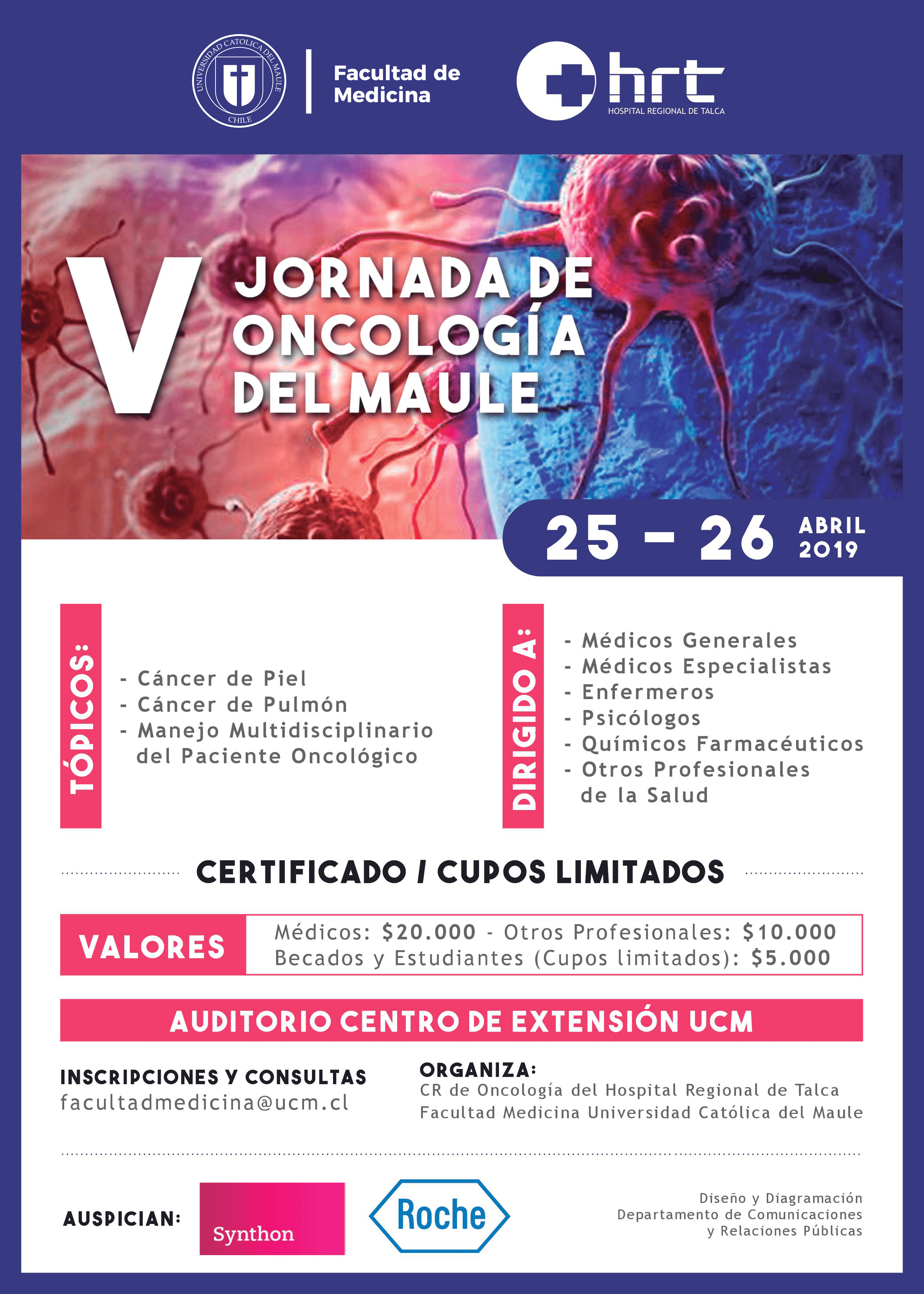 El Hospital Regional de Talca y la Facultad de Medicina de la Universidad Católica del Maule invitan a la quinta versión de las Jornadas de Oncología del Maule, que en esta oportunidad contarán con expositores especialistas en cáncer de piel y pulmonar, además presentaciones que abordarán temas respecto del manejo multidisciplinario del paciente oncológico.