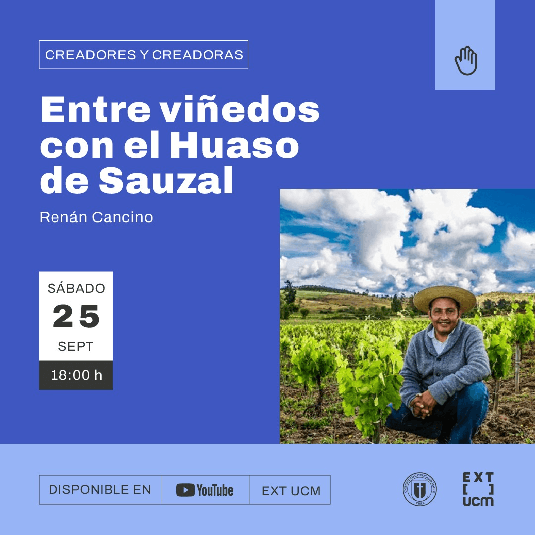 Para los amantes del buen vino y los paisajes de los viñedos que adornan el Valle del Maule, la cita es para el sábado 25 de septiembre, a las 18:00 hrs. momento en el que conoceremos la vida de Renán Cancino, el Huaso de Sauzal, viticultor que desde su tierra natal en Cauquenes y a través de un proceso totalmente artesanal, ha creado elegantes vinos que han llegado a los mejores restaurantes del continente Europeo.
