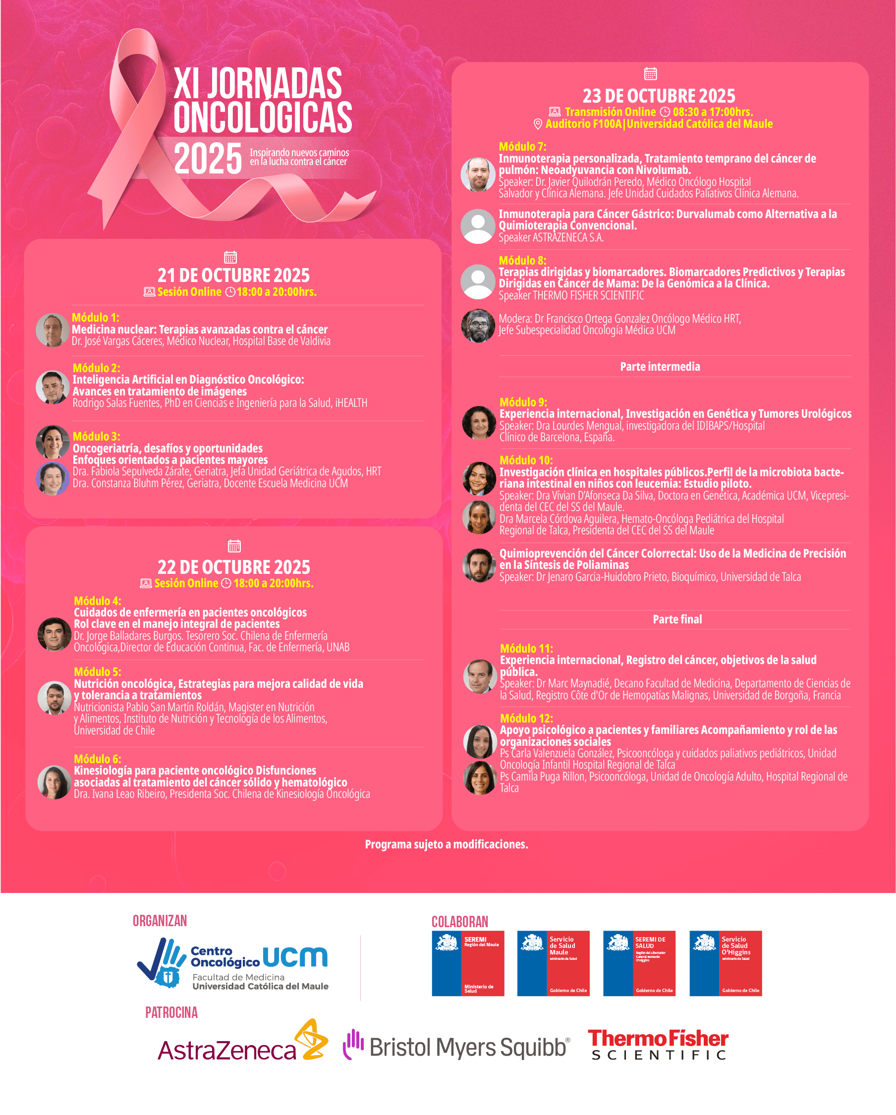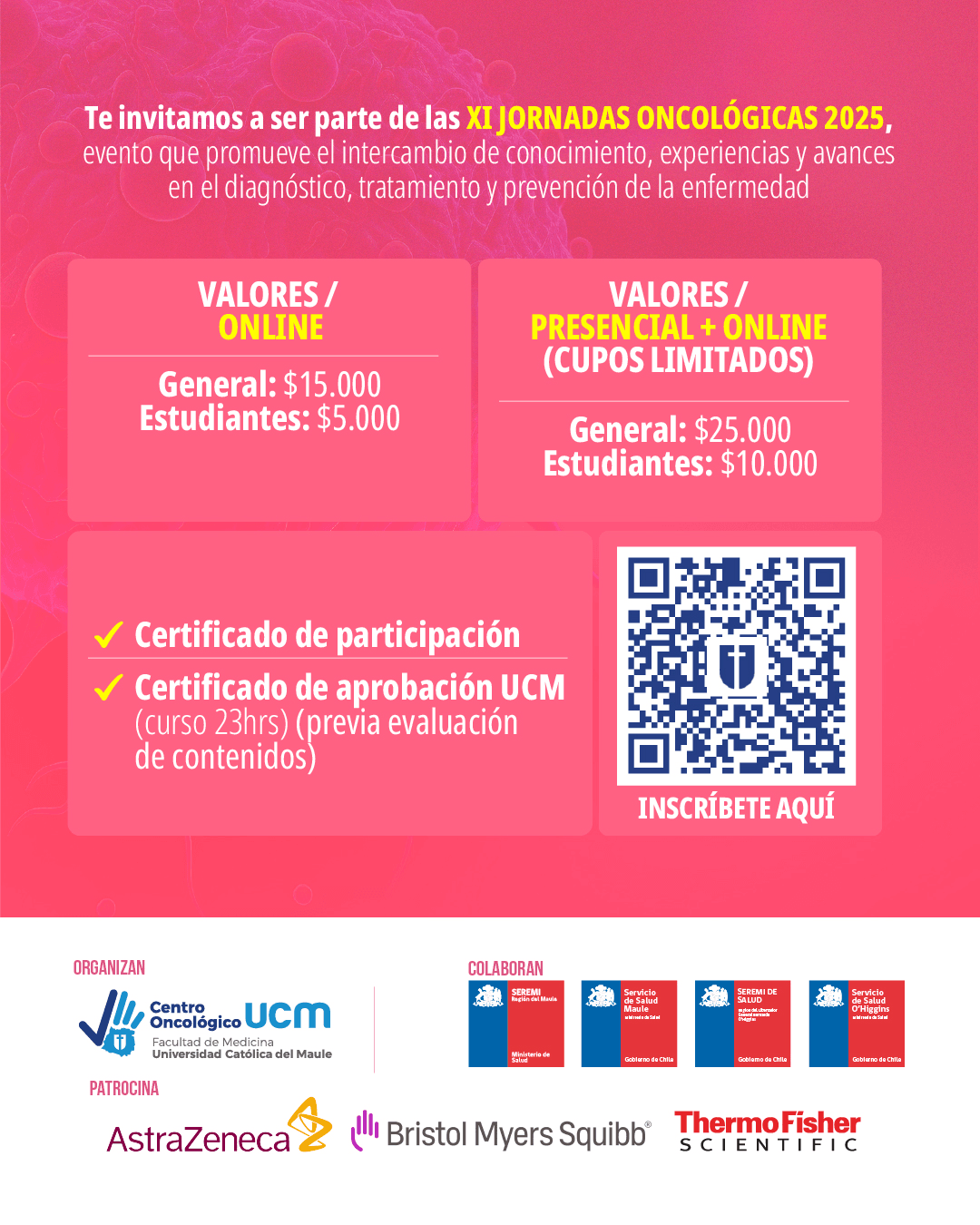 Las Jornadas cuentan con el respaldo de la Seremi de Salud del Maule y O’Higgins, los Servicios de Salud de ambas regiones, y el patrocinio de entidades privadas. Esta colaboración interinstitucional fortalece el enfoque macrorregional, alineado con las recomendaciones de la Comisión Nacional del Cáncer, que promueve redes integradas y equitativas para enfrentar esta enfermedad.